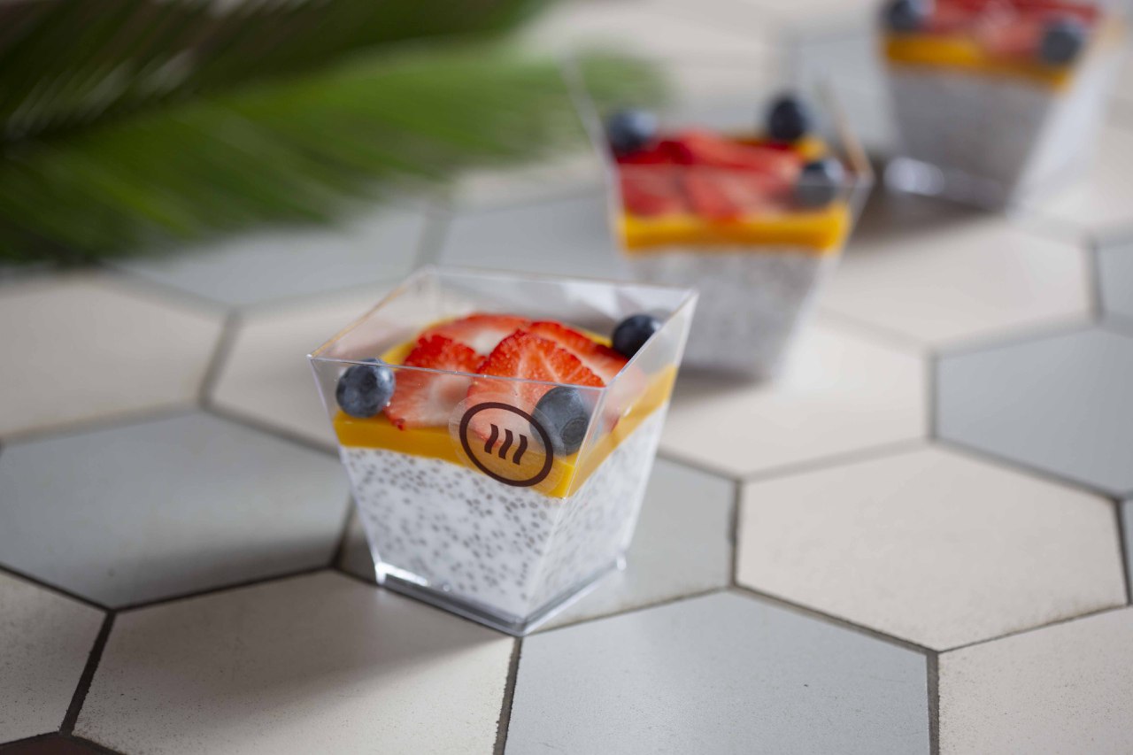 В кафе с советским флером тоже нашелся десерт без сахара. Имя ему чиа-пудинг на кокосовом молоке с тартаром из киви (то есть со свежим фруктом, нарезанным мелкими кубиками). Вместо белого сахара используют немного стевии. Его подают в стеклянной банке и украшают кокосовой стружкой, цедрой лайма и листиком мяты.