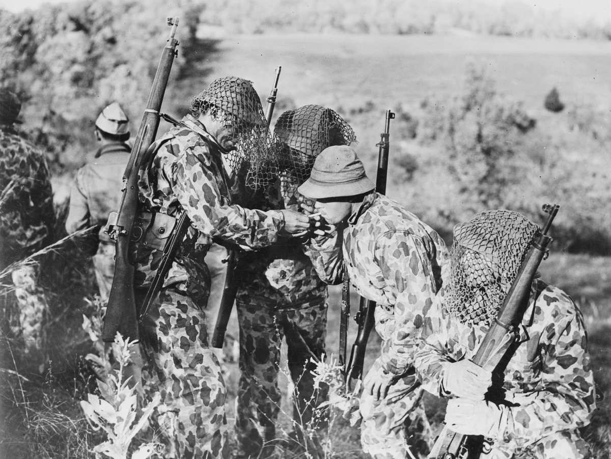 И уже во Вторую мировую войну камуфляжи применялись всеми родами войск в зависимости от географических особенностей мест предполагаемых боев. Они пользовались маскировочными костюмами с неровными пятнами (в виде амеб) коричневой или черной расцветок на зеленом фоне хаки