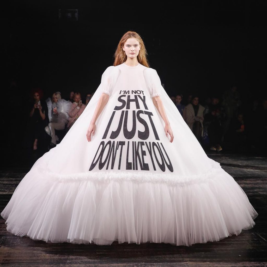 Манифесты с показа Victor & Rolf взорвали инстаграм. Голландский дуэт украсил пышные платья-пирамиды популярными фразами из социальных сетей. Например, «К черту все, я еду в Париж», «Никаких фотографий, пожалуйста», «Прости я опоздала – не хотела приходить» и другими. Пользователи сети шутят, что платья идеальны для набора стикеров какого-нибудь мессенджера.