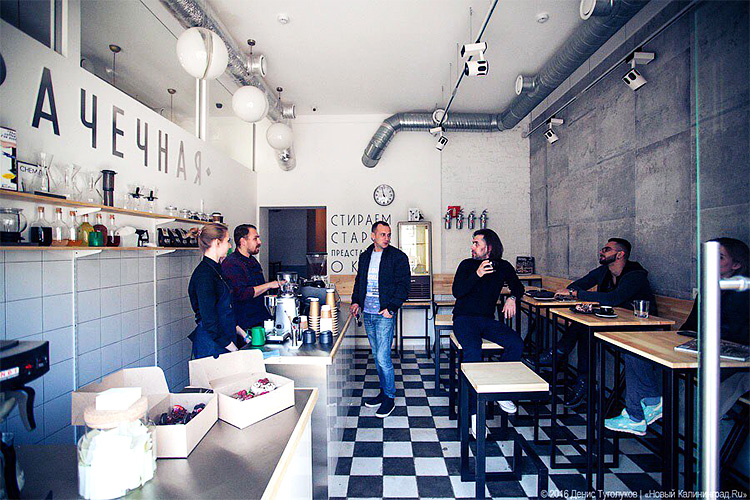 «Владельцы Дмитрий Скрябин и Илья Вареха открывали кофейню в тот период, когда в Калининграде с кофе было совсем тяжело. Дмитрий уже больше восьми лет увлекается кофе, работал в московских Mercedes Bar и «Шоколаднице». Однажды он был в Калининграде в отпуске и нигде не смог найти нормальный кофе, понял, что хочет распространять кофейную культуру в городе. В GS Coffeeshop он шеф-бариста, сам стоит за стойкой. Помимо эспрессо и флэт-уайта есть альтернатива — кемекс, пуровер, френч-пресс, аэропресс, сифон. Зерно для кофейни обжаривает московская компания Torrefacto. Команда планирует развиваться и недавно запустила новую кофейню под названием «Прачечная».